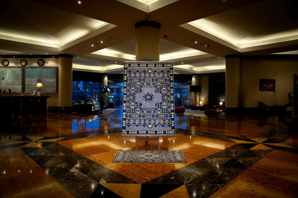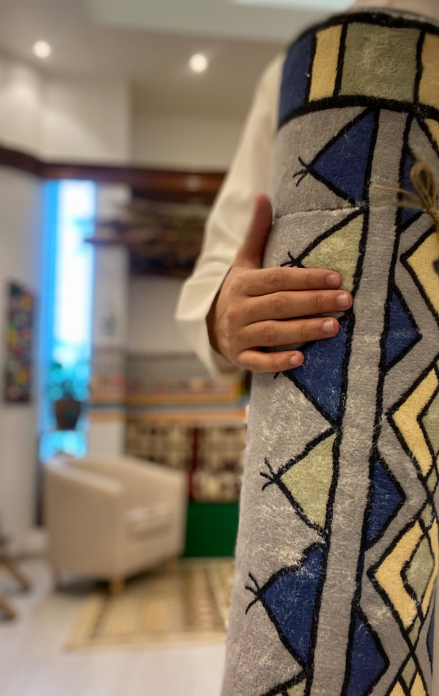 سجادة من تراث منطقة عسير الوانها مستوحاة من غيومها وضبابها ورُسِمت بأصالة من أنامل جداتنا العظيمات